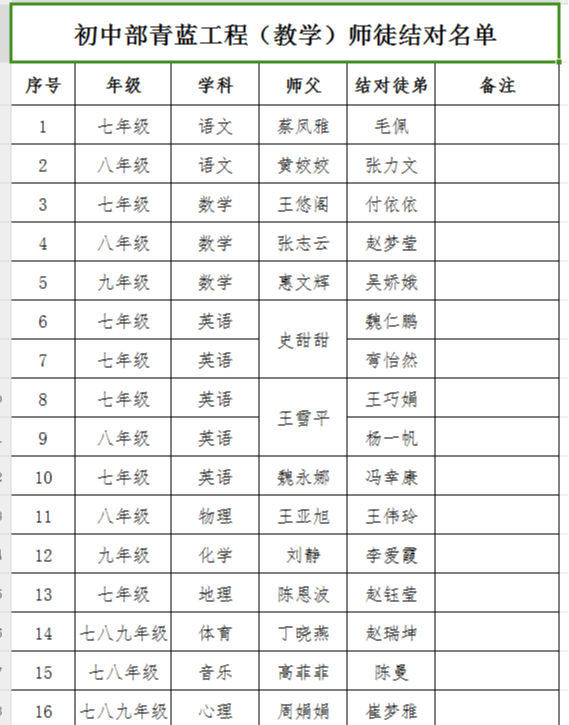 学校组织青蓝工程师徒结对,表明了学校领导对青年教师的重视和殷切期望。以老带新、以新促老、师徒结对、共同提高是青蓝工程师徒结对的重要目的。