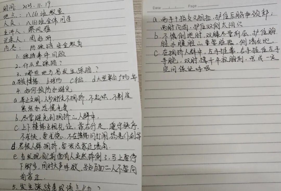 各班班主任利用班会课,从“发生踩踏事故的原因”“遇到踩踏事故应该怎么做”“如何应对人数较多的场合"“在学校参加集体活动时应该怎么做”等几方面入手,用真实的案例,以图文结合的方式给孩子们讲解踩踏事故的知识,也为孩子们敲响了警钟,要想避免发生踩踏事故,每个人要时刻把安全知识牢记心间。