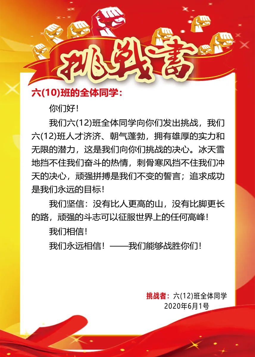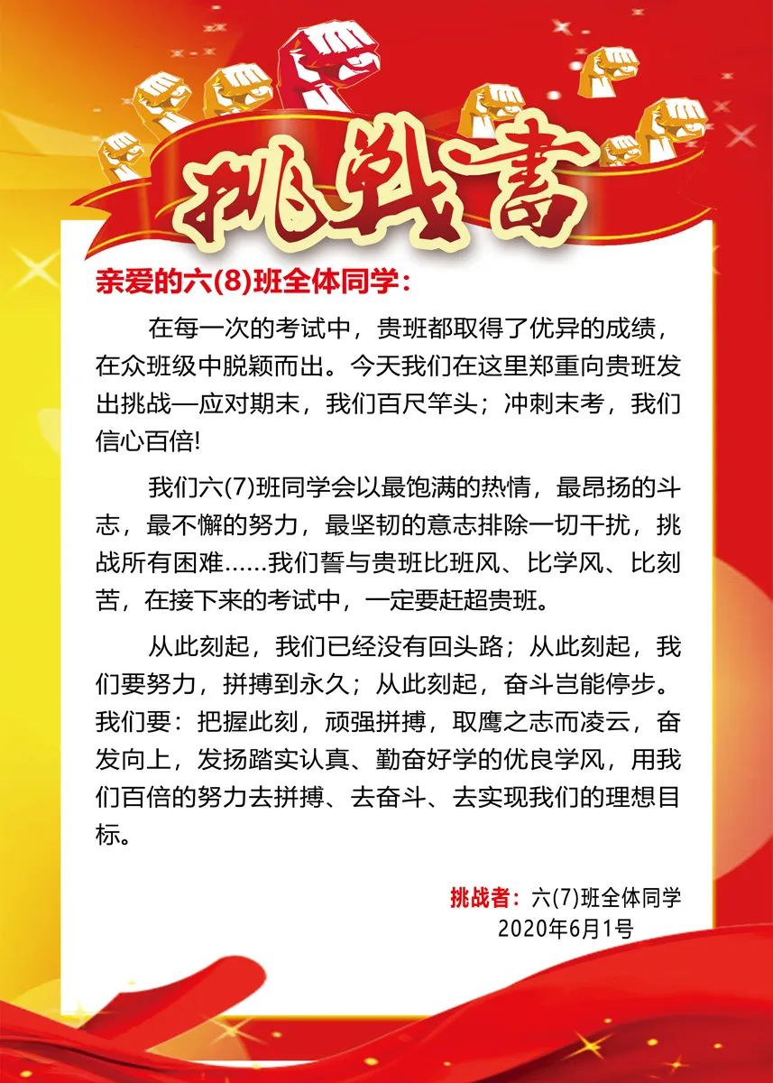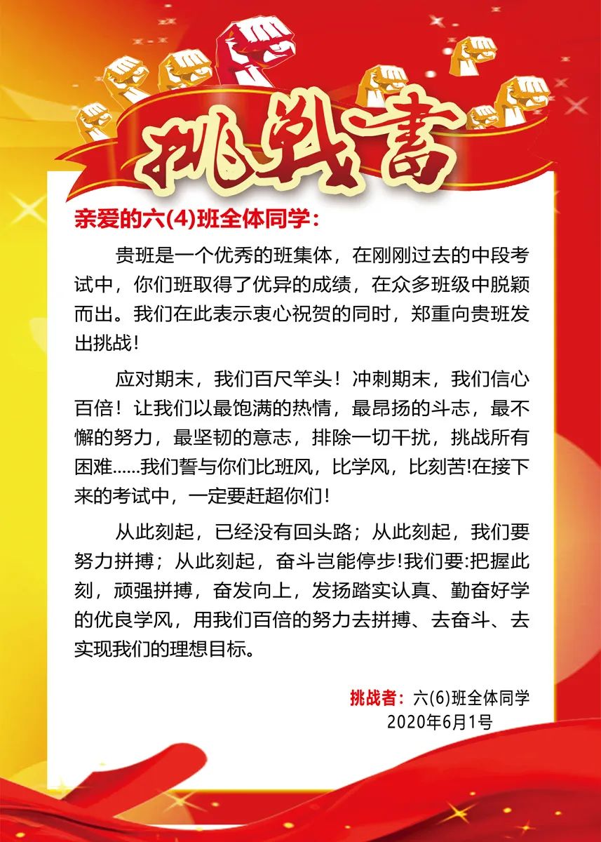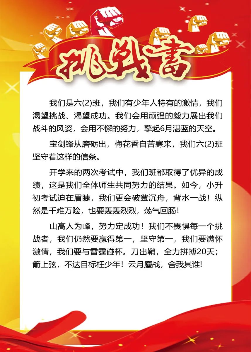 我们一定珍惜时间,挑战自我!努力拼搏,超越自我!用进步激励自己!用成绩感恩父母!用行动回报老师!六一、六一,勇争第一!齐心协力,争创佳绩!