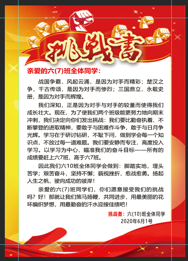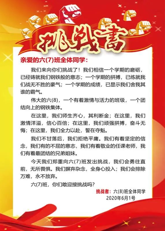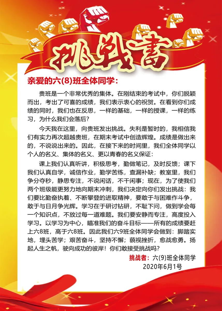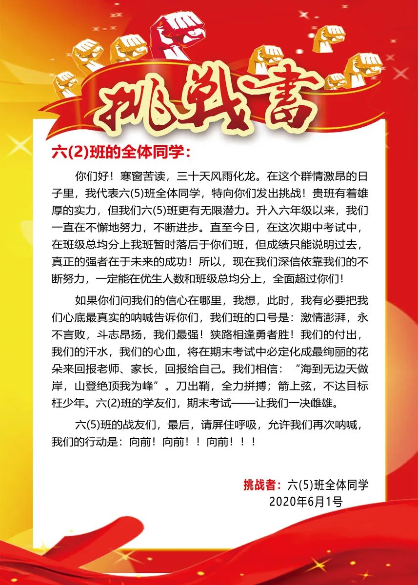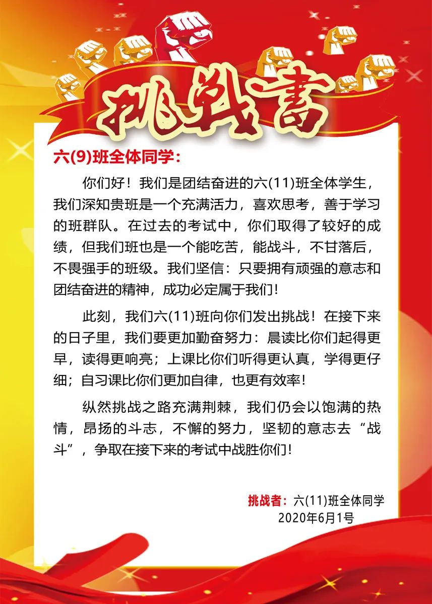 我们一定珍惜时间,挑战自我!努力拼搏,超越自我!用进步激励自己!用成绩感恩父母!用行动回报老师!六一、六一,勇争第一!齐心协力,争创佳绩!