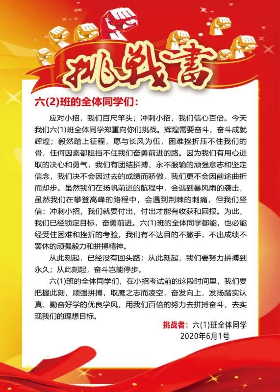 同学们,前进的号角已经吹响,美好的未来正在向我们招手,让我们以百倍的自信、充沛的精力,全身心投入到火热的学习中吧!在此,我们六年级二部全体教师郑重承诺: