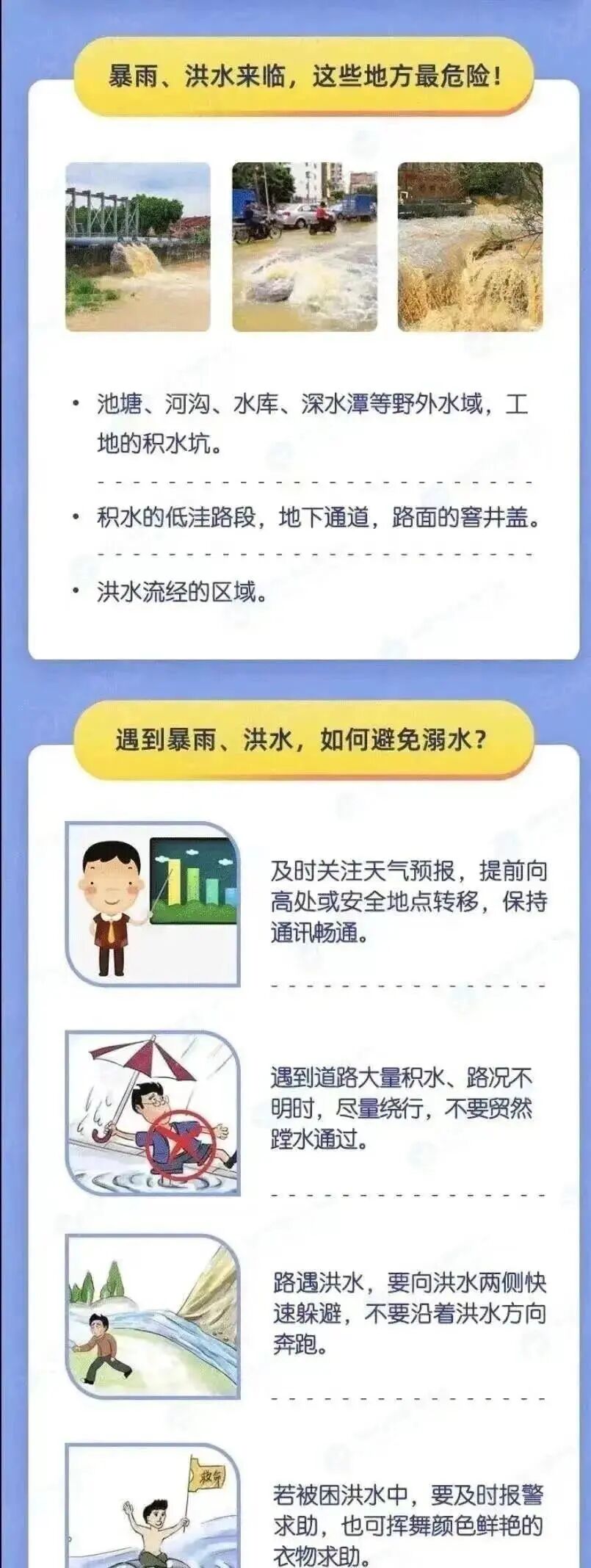 4.暴雨过后,上下学路上会增加许多水洼,请告知孩子在路上遇有水洼应绕道而行,切忌不可玩水戏水,以免发生意外。暴雨后的河水也最易暴涨,河水汹涌,非人力所能抗拒,告诫孩子对河水暴涨不要好奇,不要私自或结伴去河湖塘堰畔看水,更不能到水里游泳。