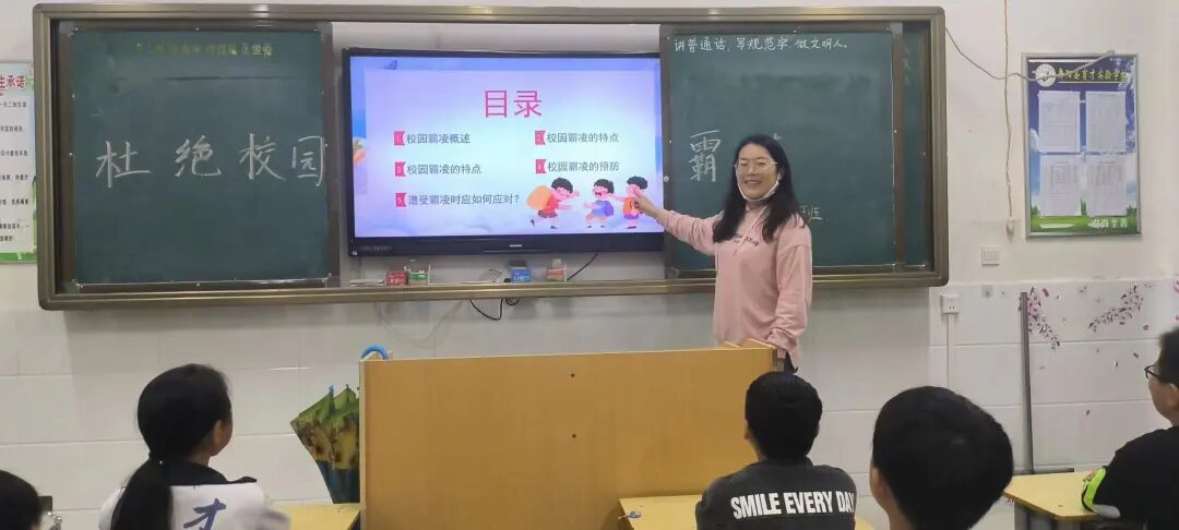 班主任从欺凌发生前的预防,校园欺凌发生后的危害、后果,以及事后报告、依法维权等几个方面进行了详细讲解,使学生知道应对校园欺凌的办法,并强调要有守法依法意识和强烈的自我保护意识,要有“见义勇为、见义智为、见义巧为”意识等。